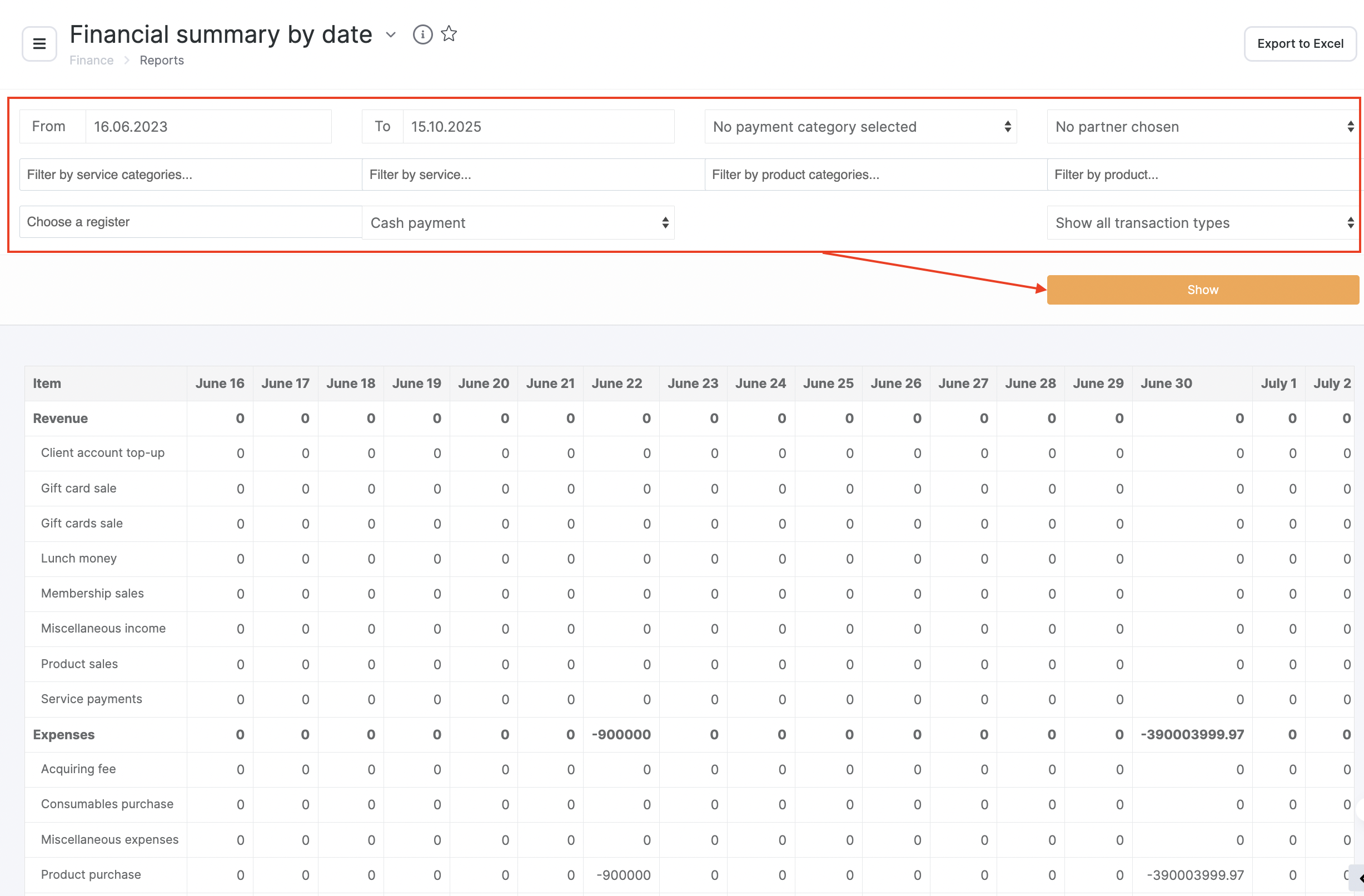 The Financial report consolidates data on all income and expenses. By default, the report displays the last week’s data, but you can manually adjust the period to view information for a different time period.