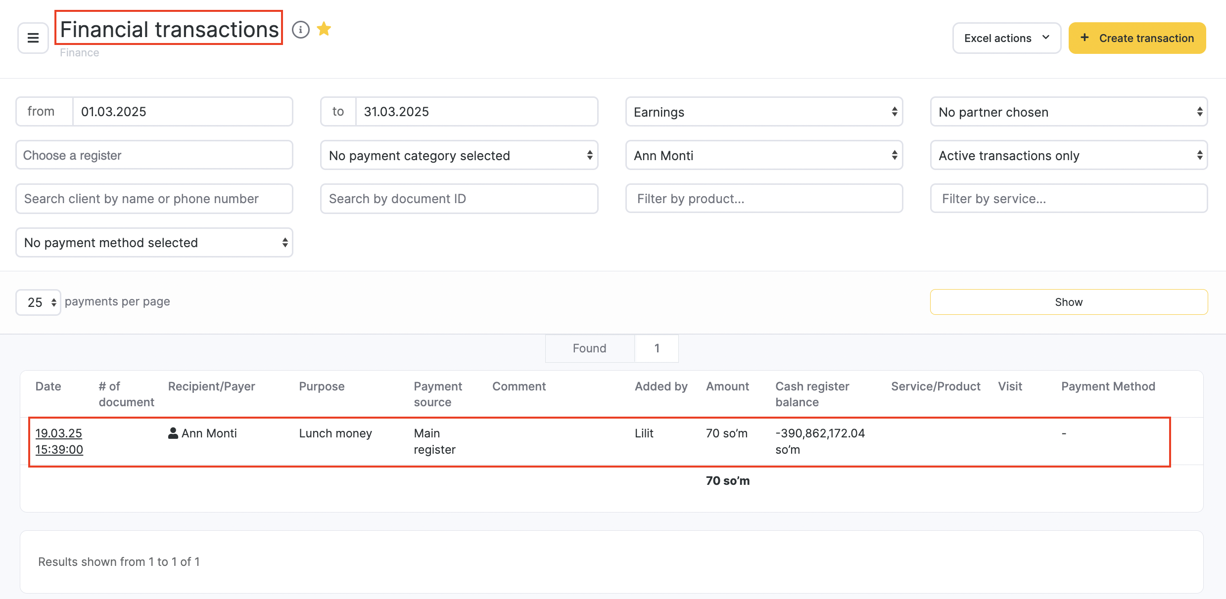 The data in the report is organized by months and presented as clickable links. By clicking on a link, Altegio will display a list of all operations related to the selected item and period, allowing for easy access to detailed information.