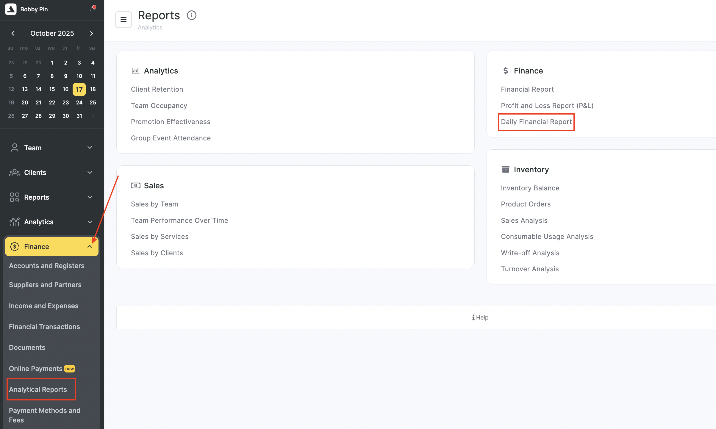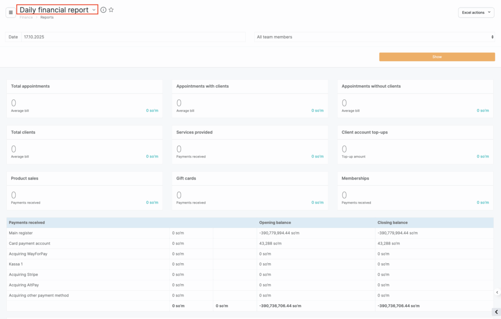 To automatically form the report go to the Finance – Analytical Reports – Daily Financial Report section.