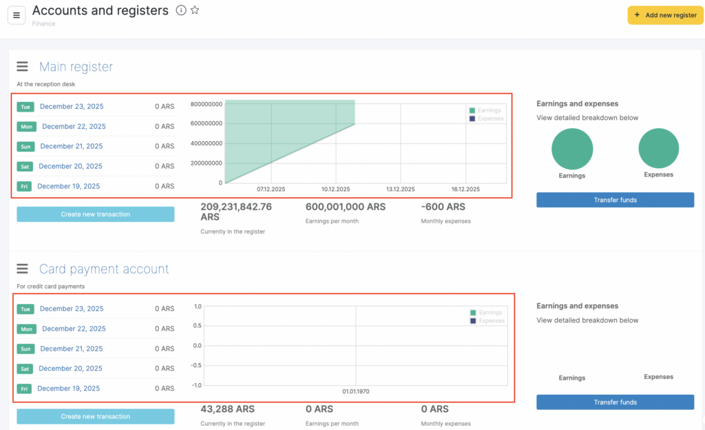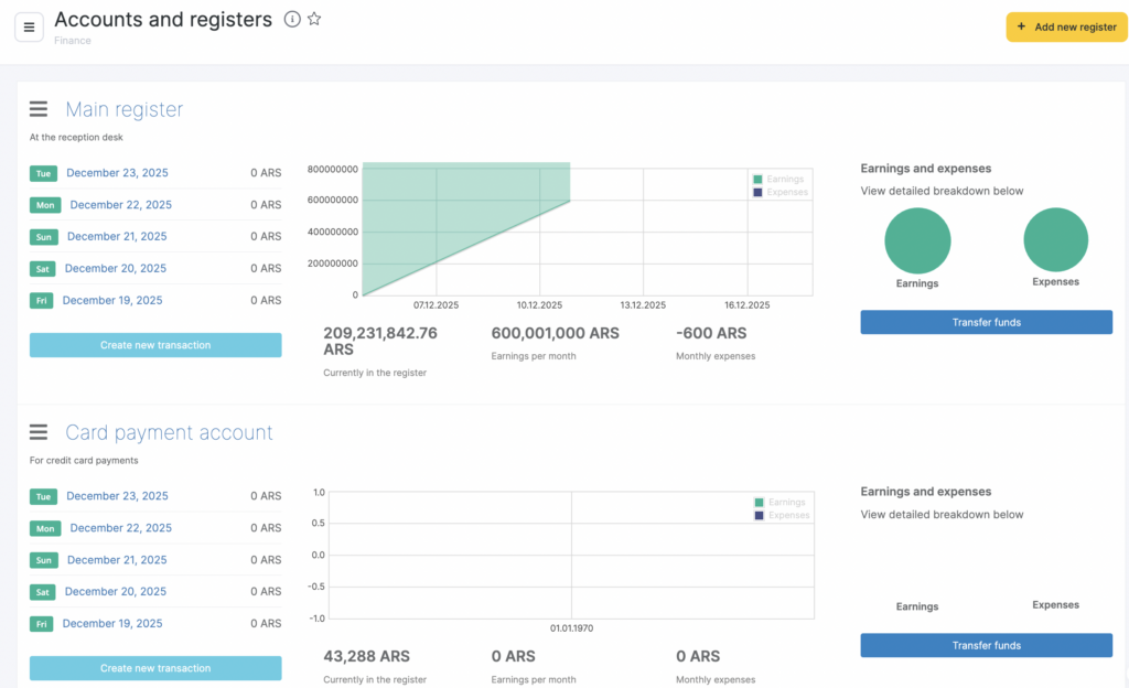 You can view the real-time financial transactions of each cash register in this section. It displays all the income and expenses for the month, as well as the latest accruals and expenditures. Additionally, you can transfer funds between cash registers and edit their information.
