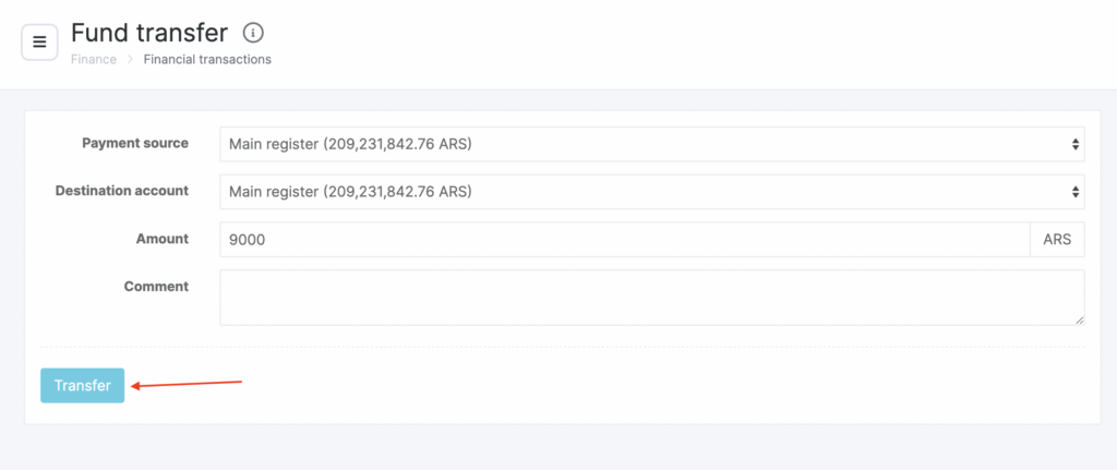 - Click Transfer funds in Finance > Accounts and cash registers.