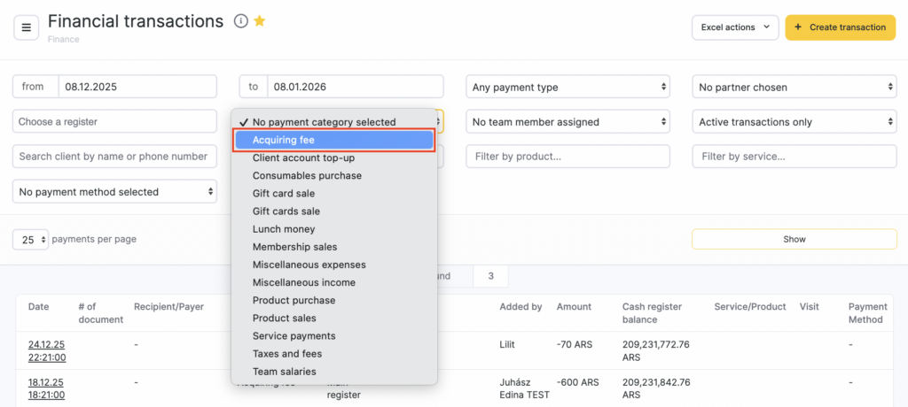 Expenses under the Acquiring fee item will be shown in Finance > Financial transactions, in the financial report for a period, and in the P&L report.