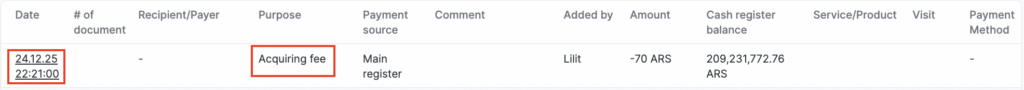 With each cashless payment, the bank charges a fee as a fixed percentage, and this percentage is deducted from the company’s revenue. For more detailed expense tracking, you can set up automatic write-off of the fee when funds are credited to the cash desk for cashless payments.