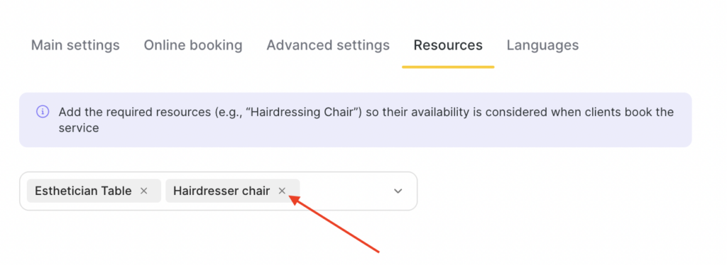 When a client independently books online for a service that has resources linked to it, one available instance of each linked resource is booked by default.