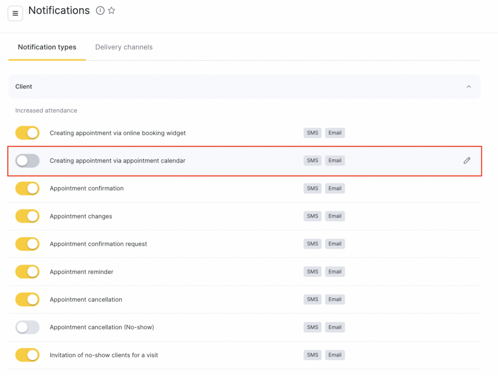 To disable sending an SMS notification when an appointment is created in the booking journal, go to Settings > System settings > Notifications, open the Notification types tab, and switch off the toggle next to Appointment created via the appointment calendar.