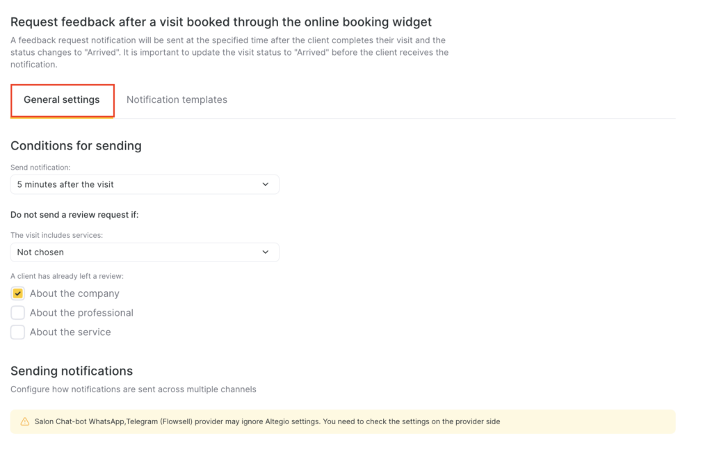 A review request notification will be sent after the selected time once the client completes their visit and the visit status changes to Arrived. It is important to change the visit status to Arrived before the moment when the client is supposed to receive the notification.