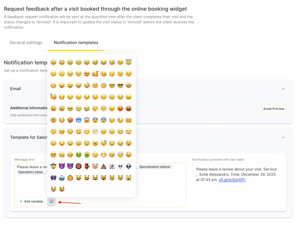 - In SMS notification templates, you can use emoji. To do this, click the emoji button and select the one you need from the suggested options or add your own.