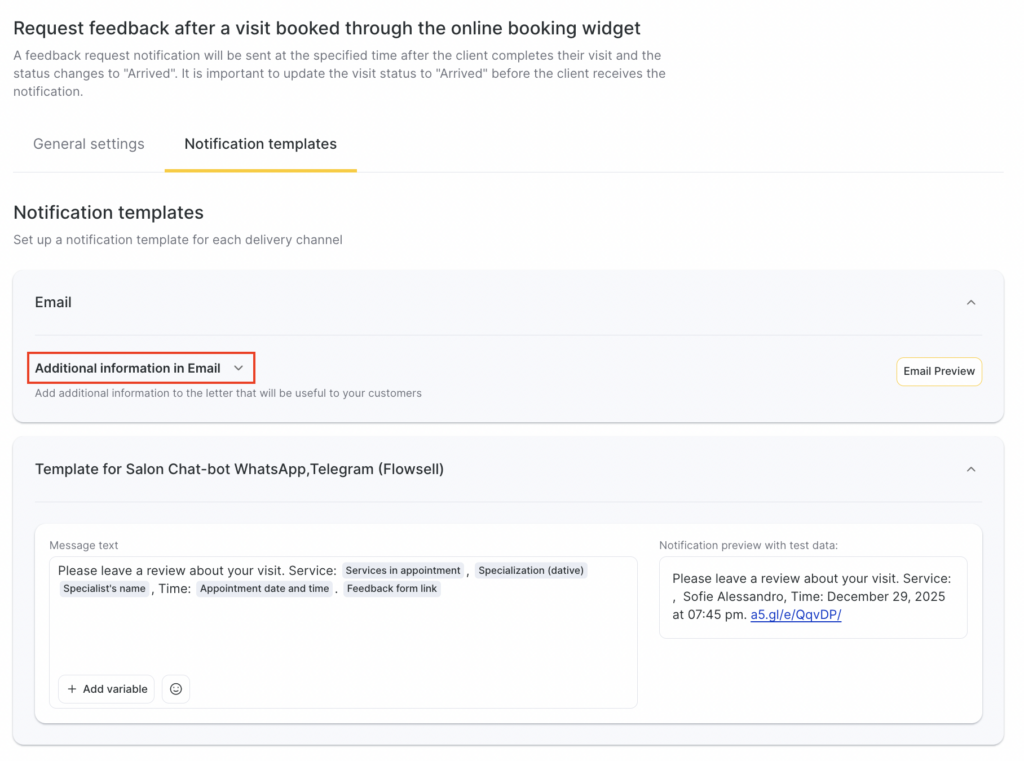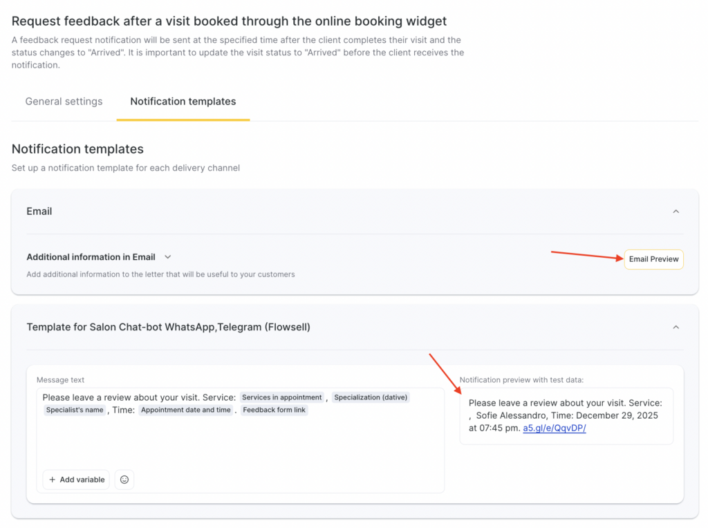 For all notification templates, preview is available — how the message will look when sent to a client, team member, or receptionist, including variables.