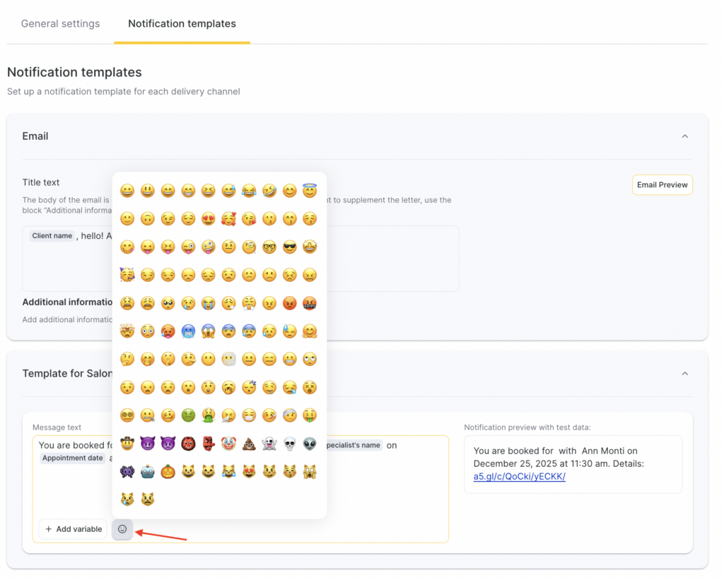 - In SMS notification templates, you can use emoji. To do this, click the emoji button and select one of the suggested options or add your own.