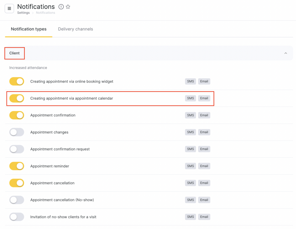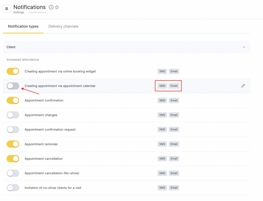 - In the Client > Increased attendance section, select Creating appointment via Appointment Calendar. To edit the conditions, sending scenarios, and templates, click the notification name or the pencil icon.