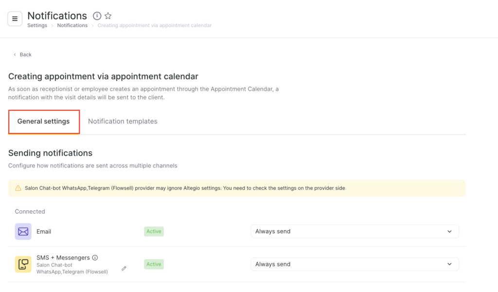 - On the General settings tab, set up how notifications will be sent via multiple channels. More details about multi-channel notification scenarios are available in the article. Available sending channels: