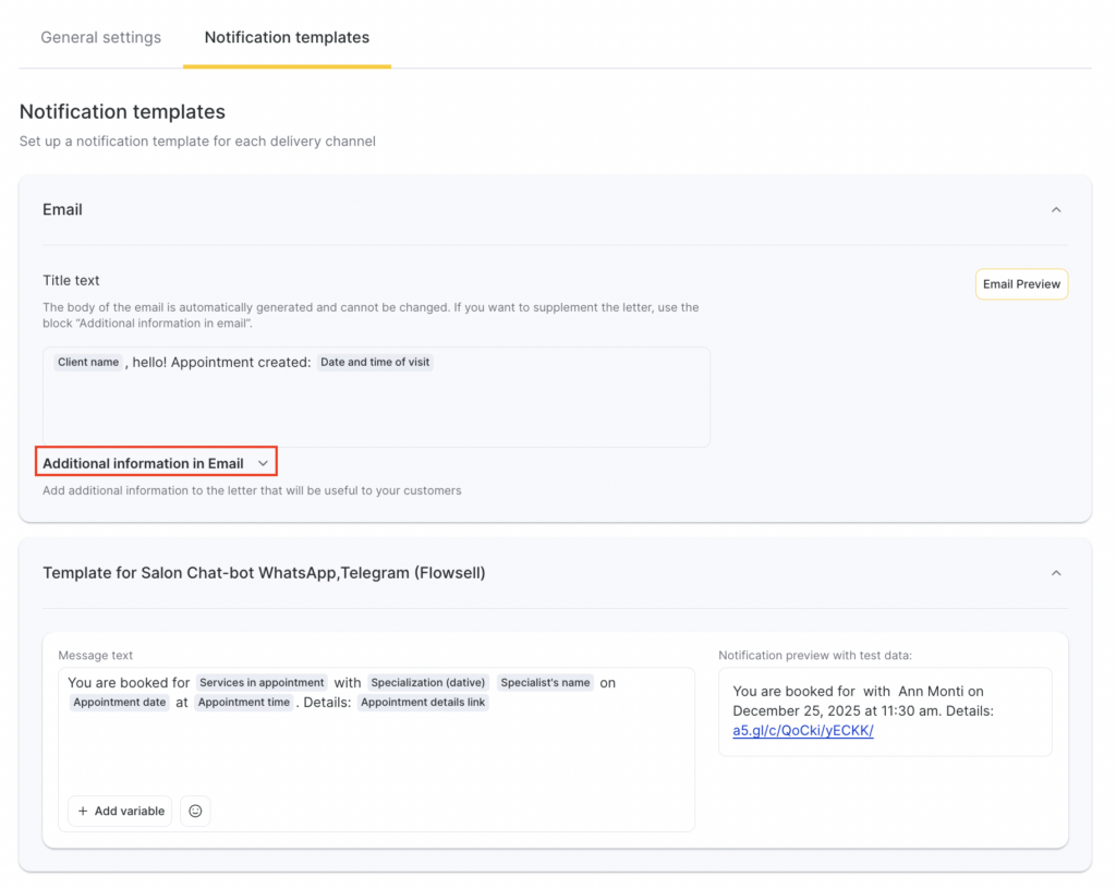 For all notification templates, preview is available — how the message will look when sent to a client, team member, or receptionist, including variables.