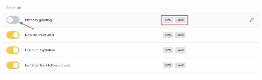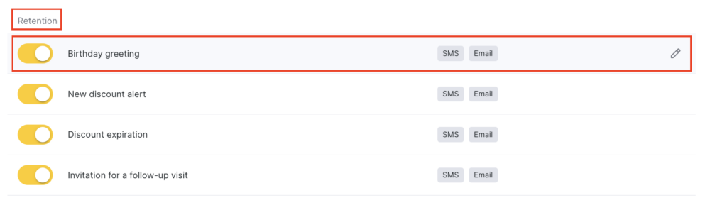 - In the Client > Retention section, select Birthday greeting by clicking the notification name or the pencil icon.