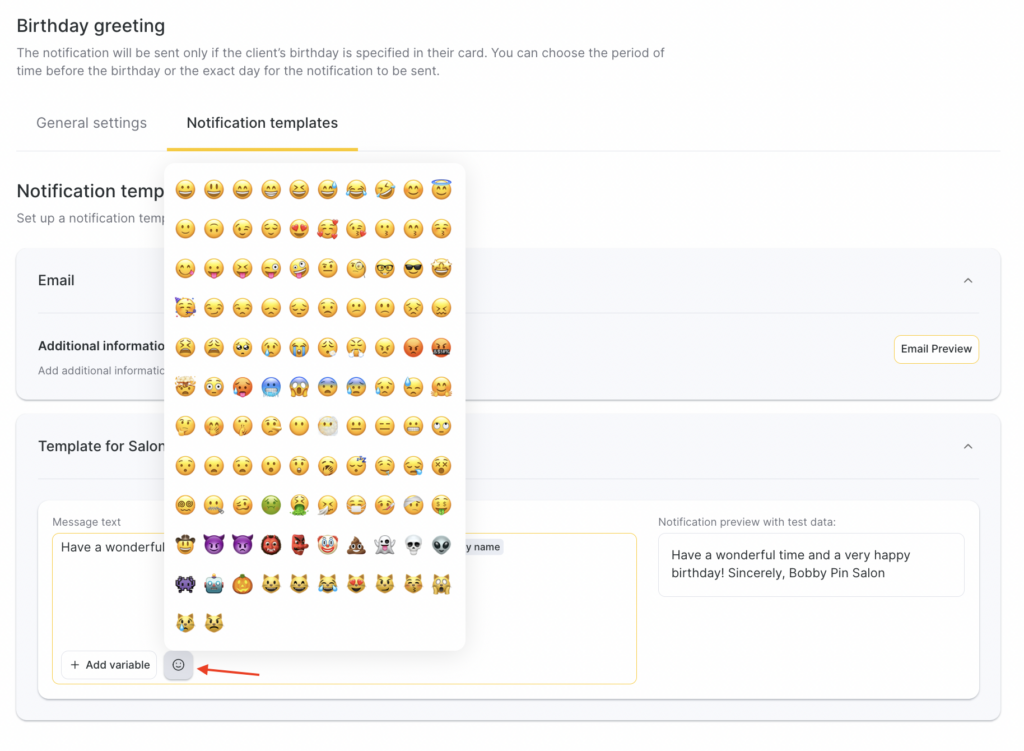 In SMS notification templates, you can use emoji. To do this, click the smiley button and choose one from the list or add your own.