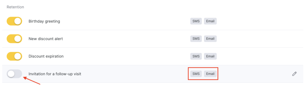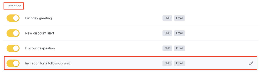 - In the Client > Retention section, select Invitation for a follow-up visit by clicking the notification name or the pencil icon.