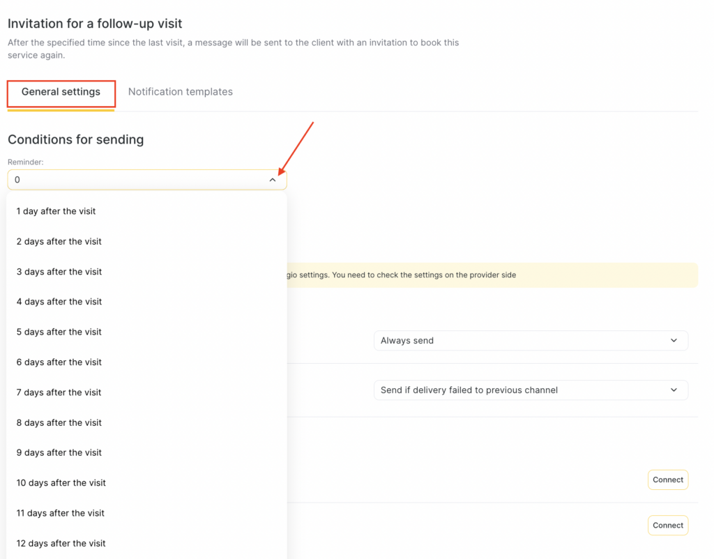 Reminder Select when the client will receive the notification — after N days (from 1 to 30), after N weeks (from 5 to 20), or after N months (from 2 to 6 or 12).