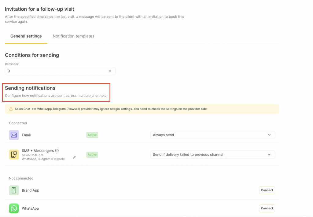 Automatic message inviting the client to book another visit. The notification will be sent if, within the specified period, the client has not made an appointment with the company for a service. The check is performed for each service separately. If the notification periods совпадают for two services, one notification will be sent listing both services.