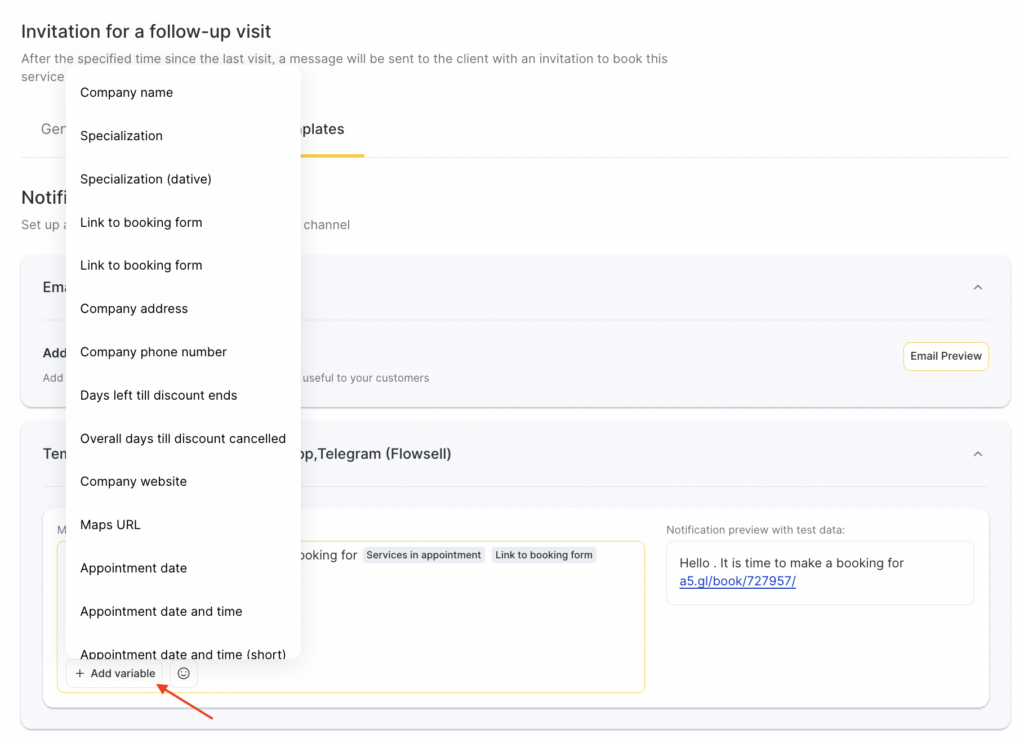 - For the SMS template, variables are available — they will automatically insert visit, service, client, or branch data. To add a variable to the template, click Add variable, then choose the one that fits the context.