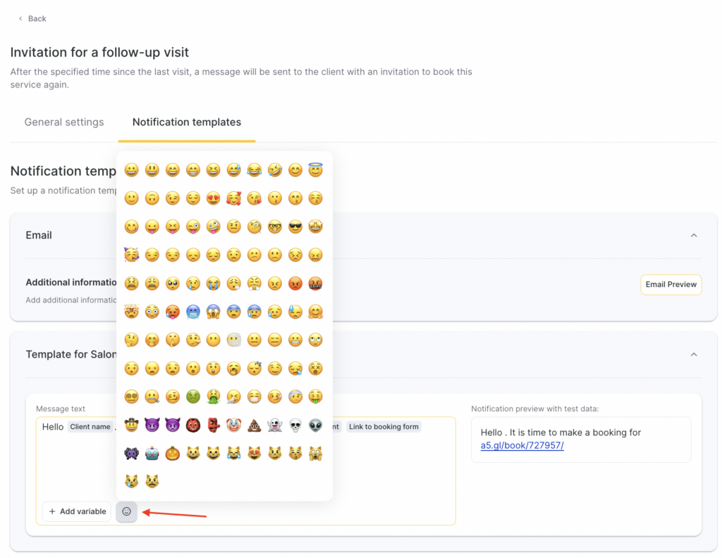 In SMS notification templates, you can use emoji. To do this, click the smiley button and choose one from the list or add your own.