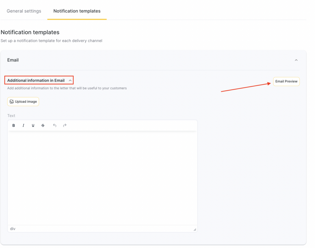 - For the Email channel, editing the template is not available, but you can add additional information. To do this: