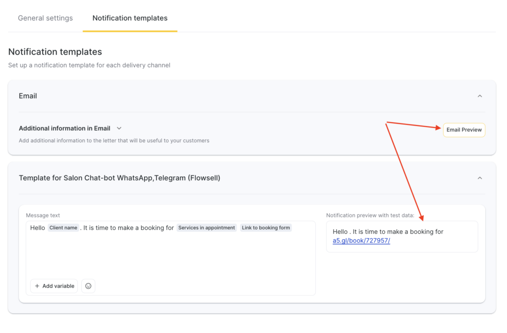 - For all notification templates, preview is available — how the message will look when sent to a client, employee, or administrator, taking variables into account.