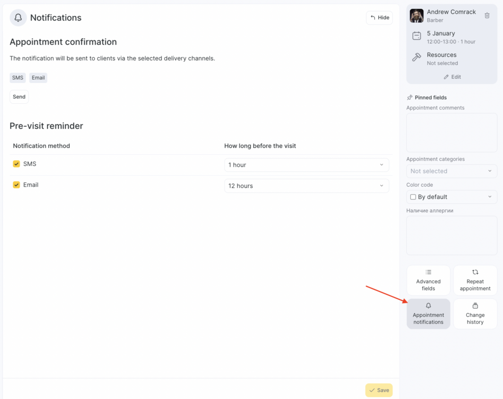 You can also change the period for a specific service in the visit window, in the Appointment notifications section.