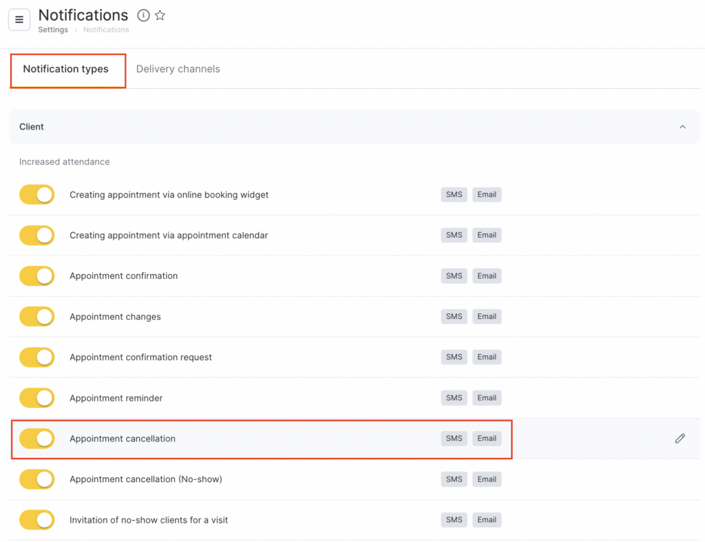 In the Client > Increased attendance section, select Appointment cancellation by clicking the notification name or the pencil icon.