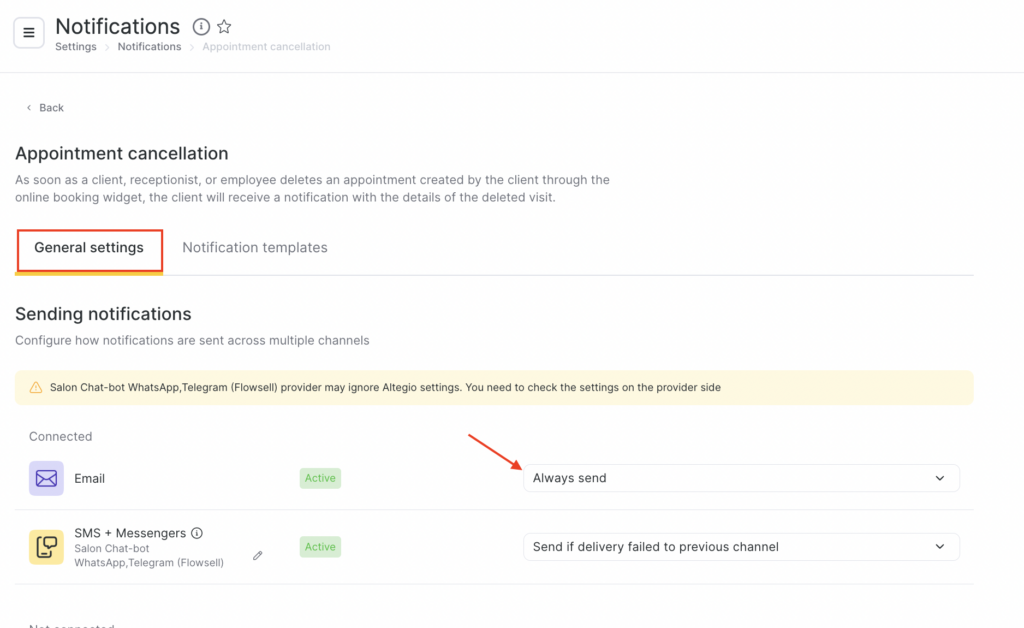 On the General settings tab, set up how notifications will be sent via multiple channels. More details about multi-channel notification scenarios are available in the article. Available sending channels: