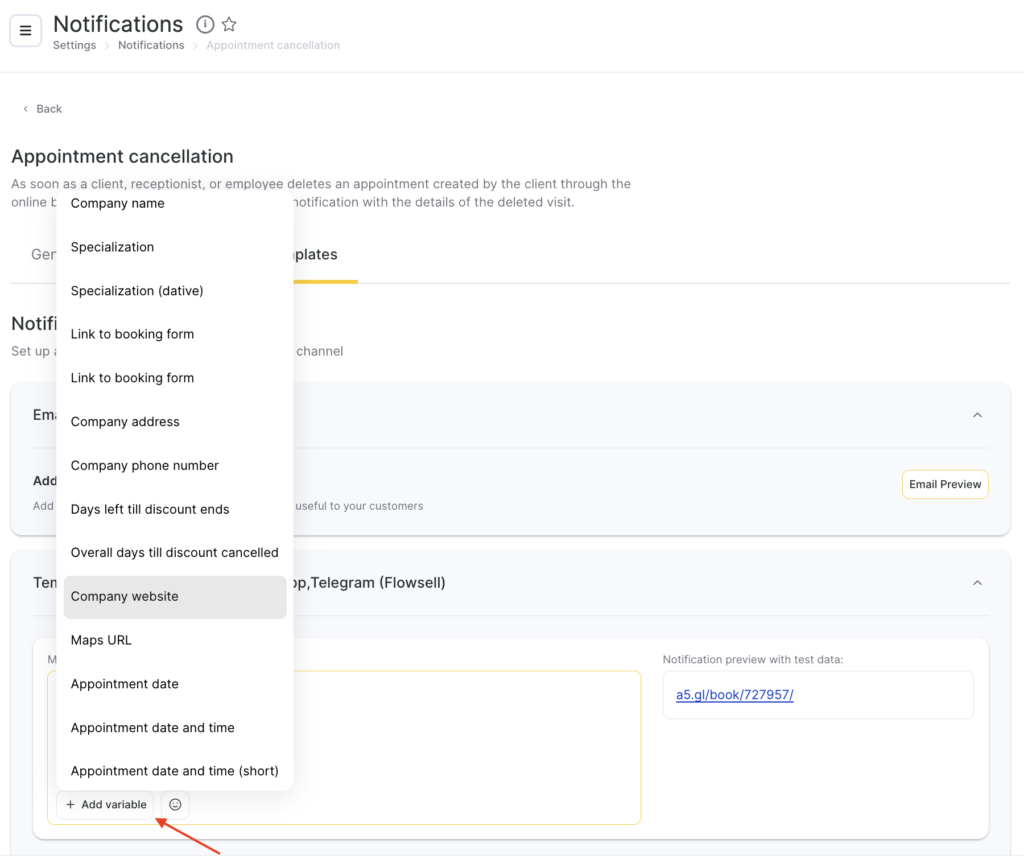 - For the SMS template, variables are available — the system will automatically insert visit, service, client, or branch details in their place. To add a variable to the template, click Add variable, then choose the one that matches the meaning.