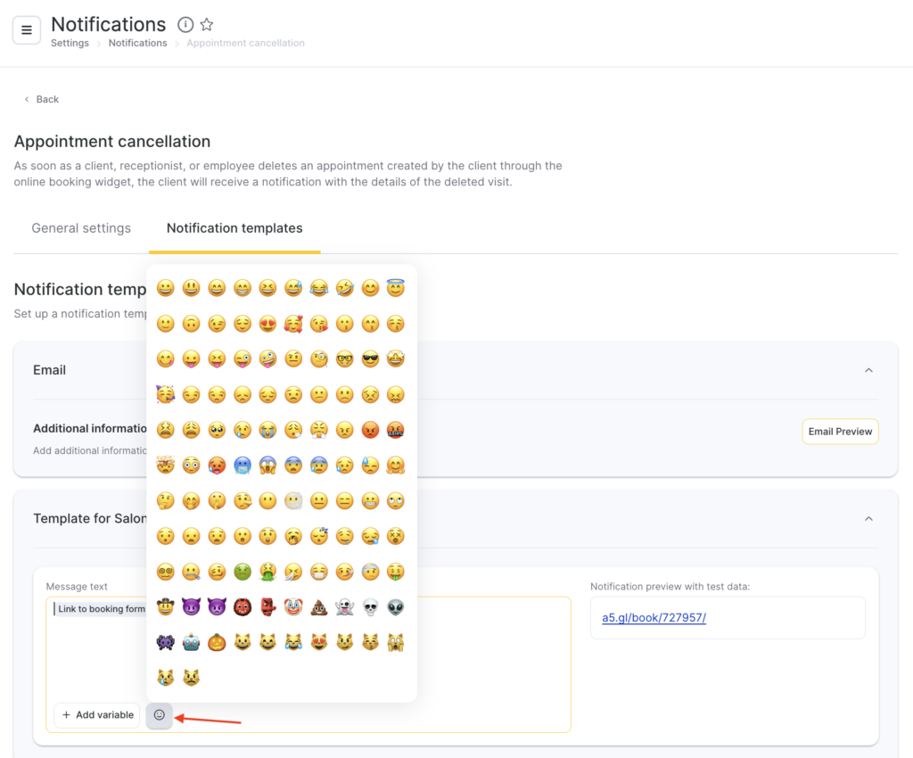 In SMS notification templates, you can use emoji. To do this, click the emoji button and select the one you need from the suggested options or add your own.