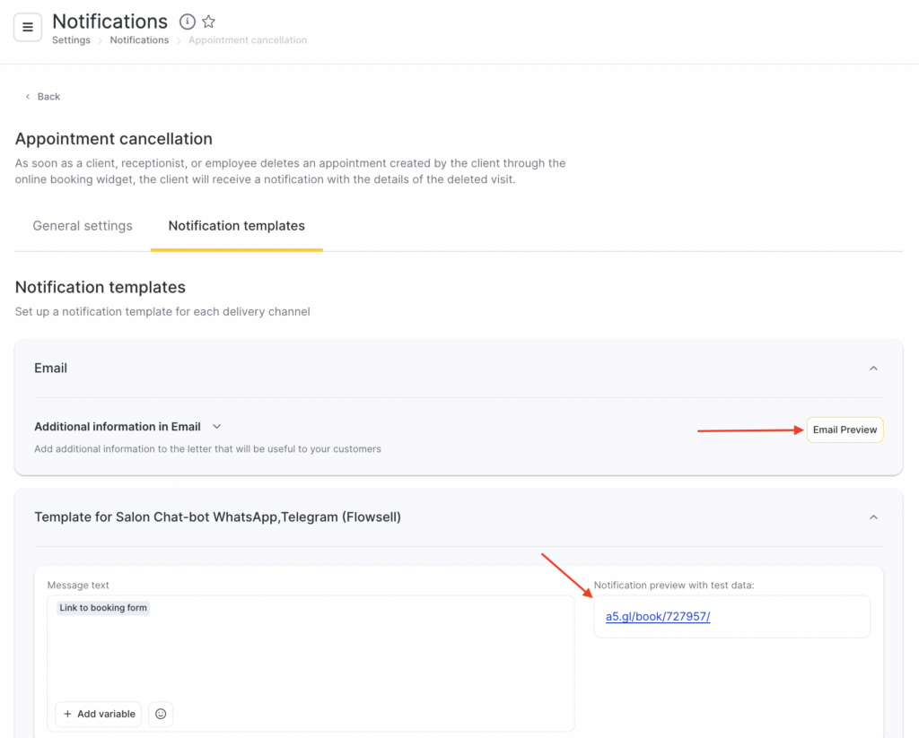 For all notification templates, preview is available — how the message will look when sent to a client, team member, or receptionist, including variables.