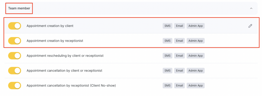 - In the Team Member section, select Appointment creation by client / Appointment creation by receptionist by clicking the notification name or the pencil icon.