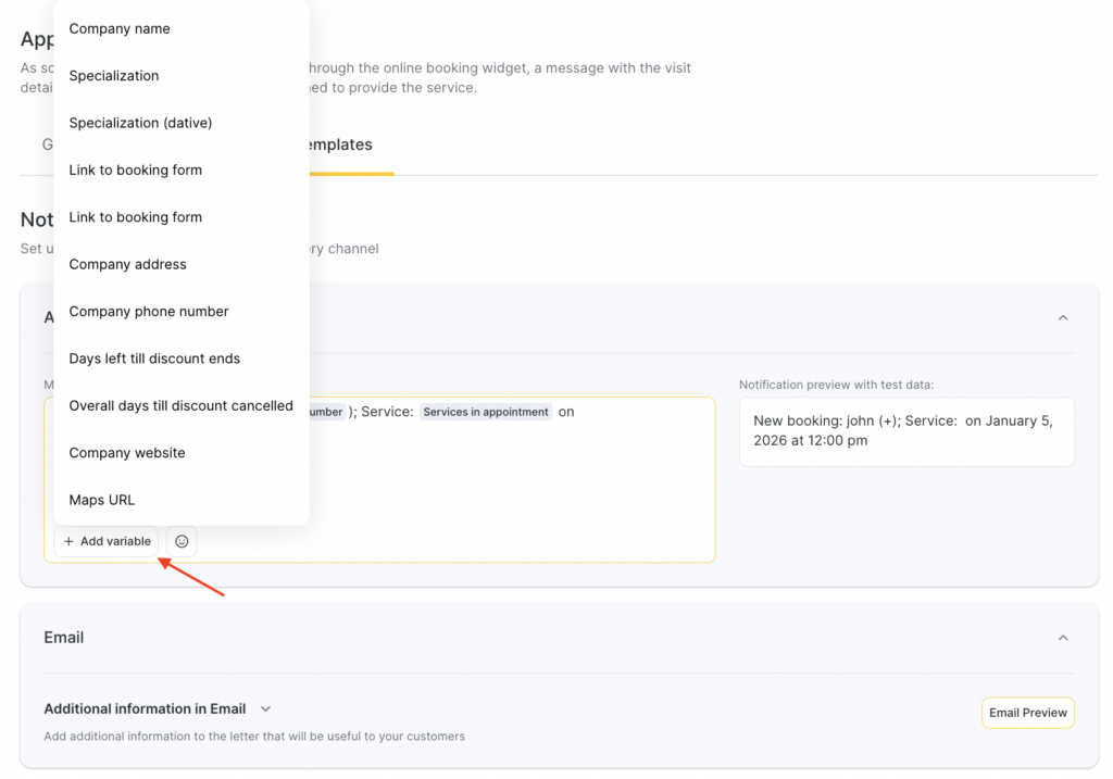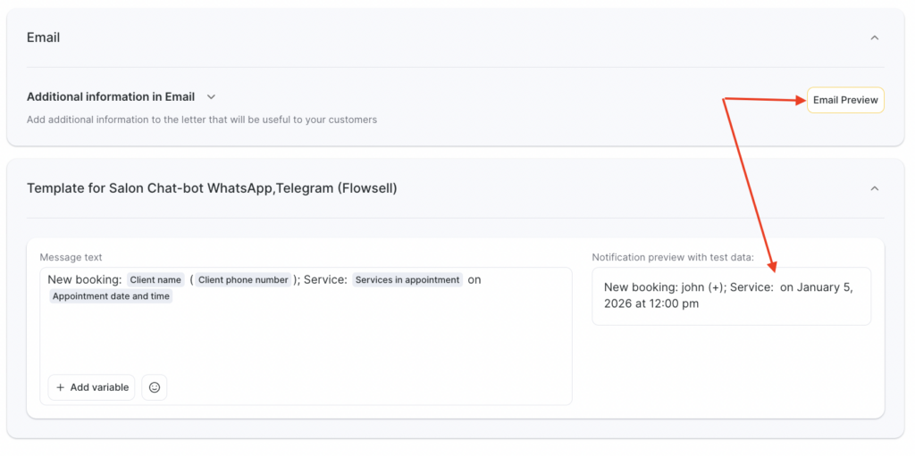 For all notification templates, preview is available — how the message will look when sent to a client, team member, or receptionist, taking variables into account.