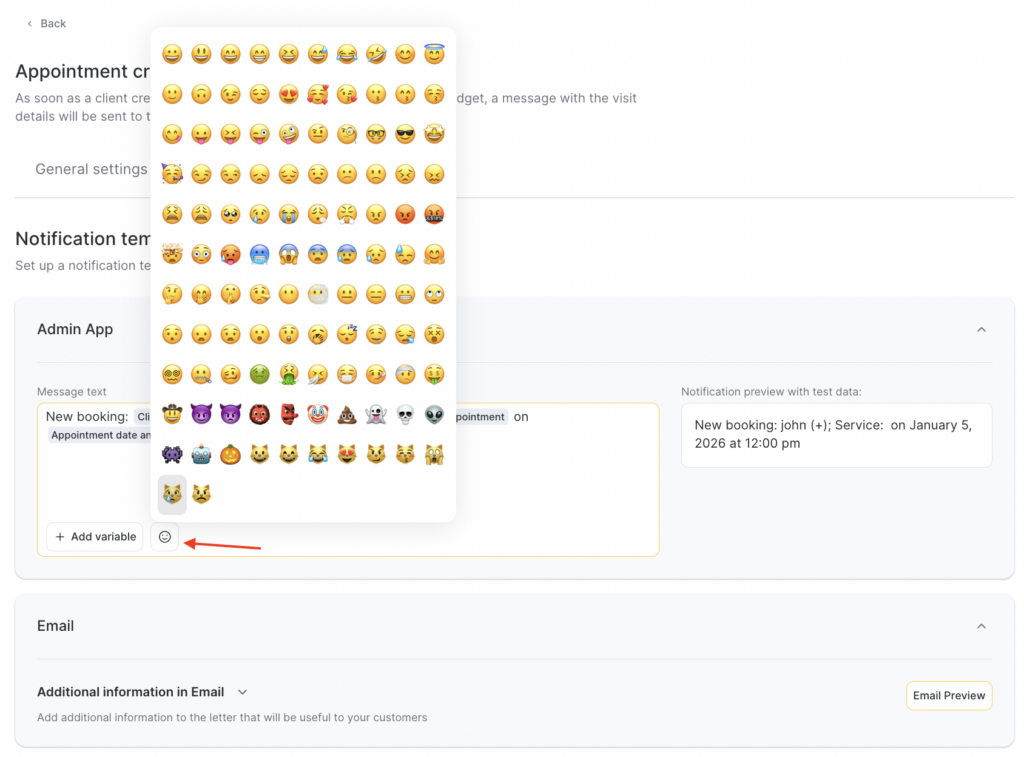 In SMS notification templates, you can use emoji. To do this, click the smiley button and choose one from the list or add your own.