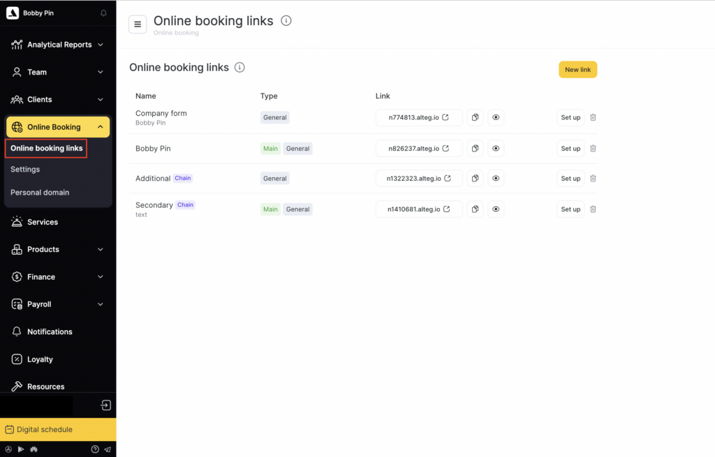 - Select the required online booking link and click its name or the Set up button to open editing mode.