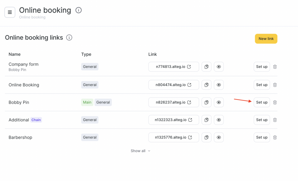 - Select the required online booking link and click its name or the Set up button to open editing mode.