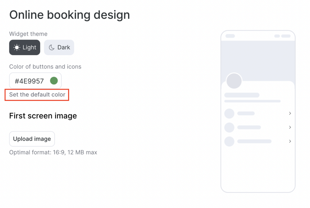 - To upload an image for the first screen, click Upload image. In the window that opens, find the Online booking design section.