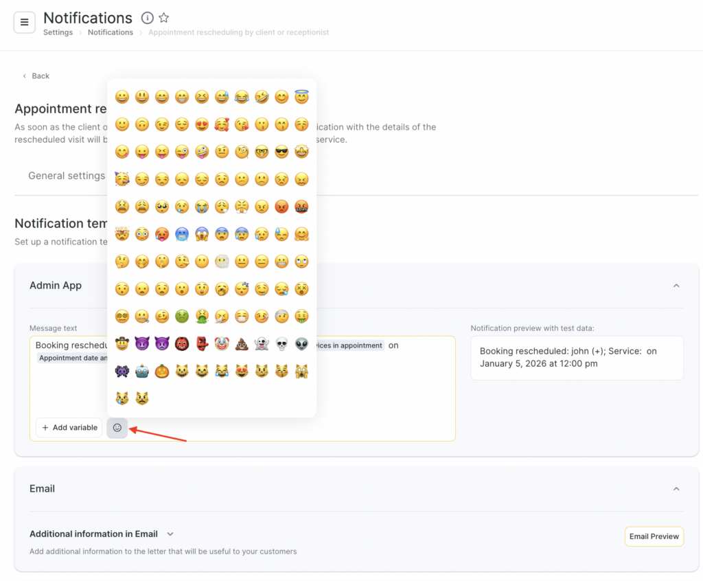 In SMS notification templates, you can use emoji. To do this, click the smiley button and choose one from the list or add your own.