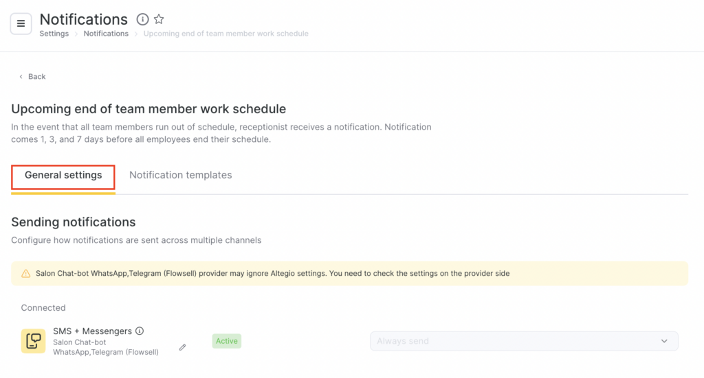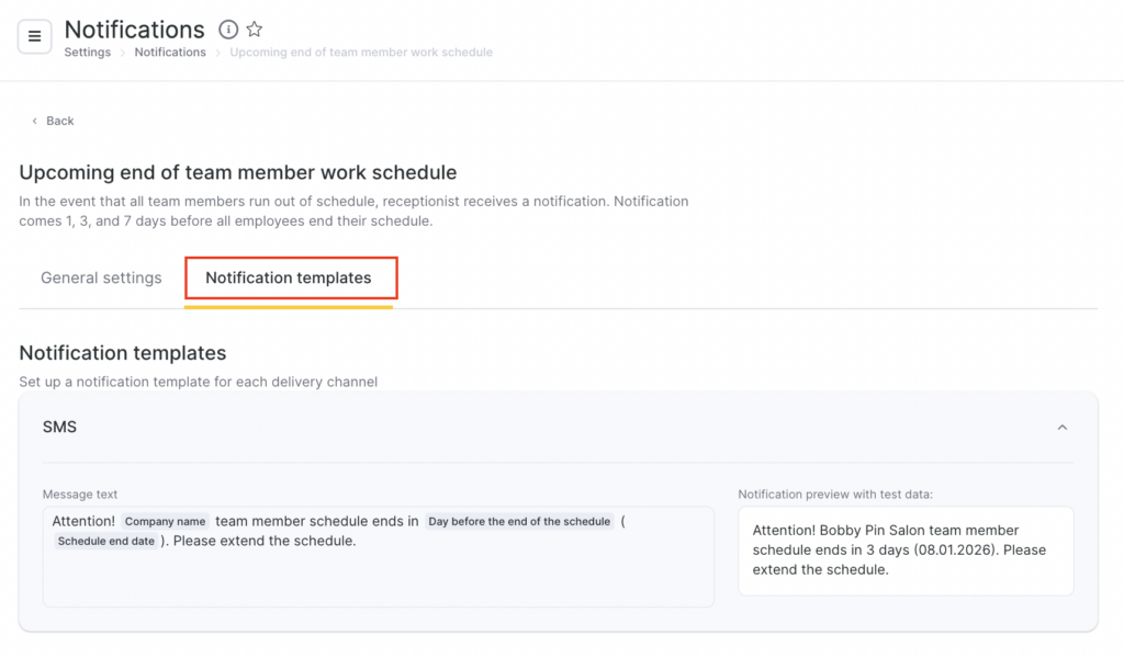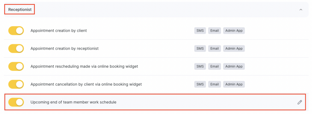 - In the Receptionist section, select Upcoming end of team member work schedule by clicking the notification name or the pencil icon.