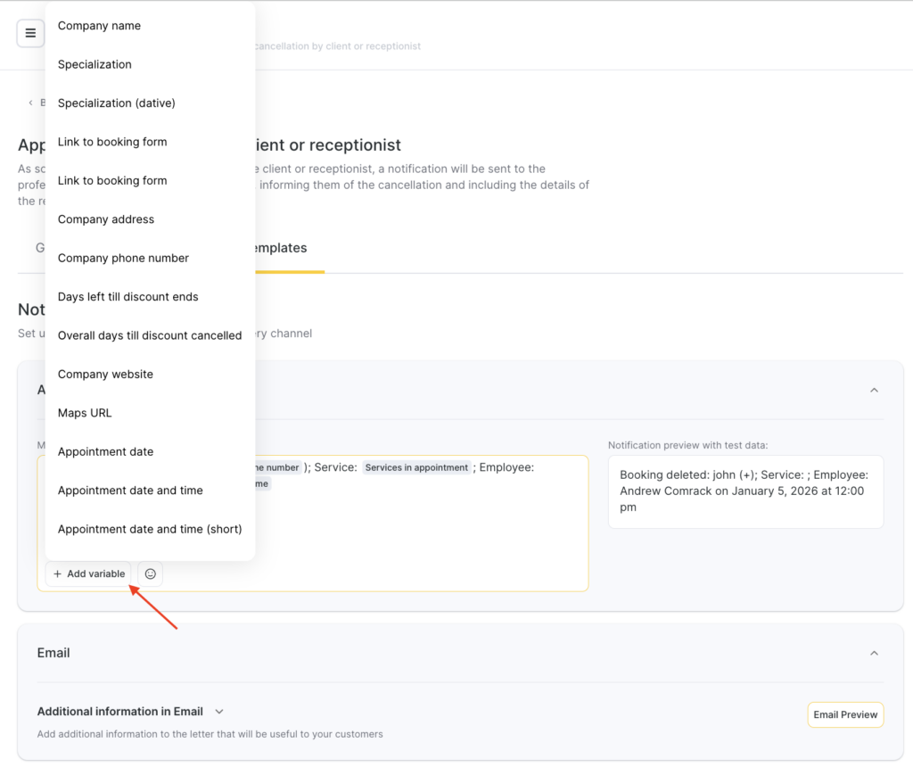 For all notification templates, preview is available — how the message will look when sent to a client, team member, or receptionist, taking variables into account.