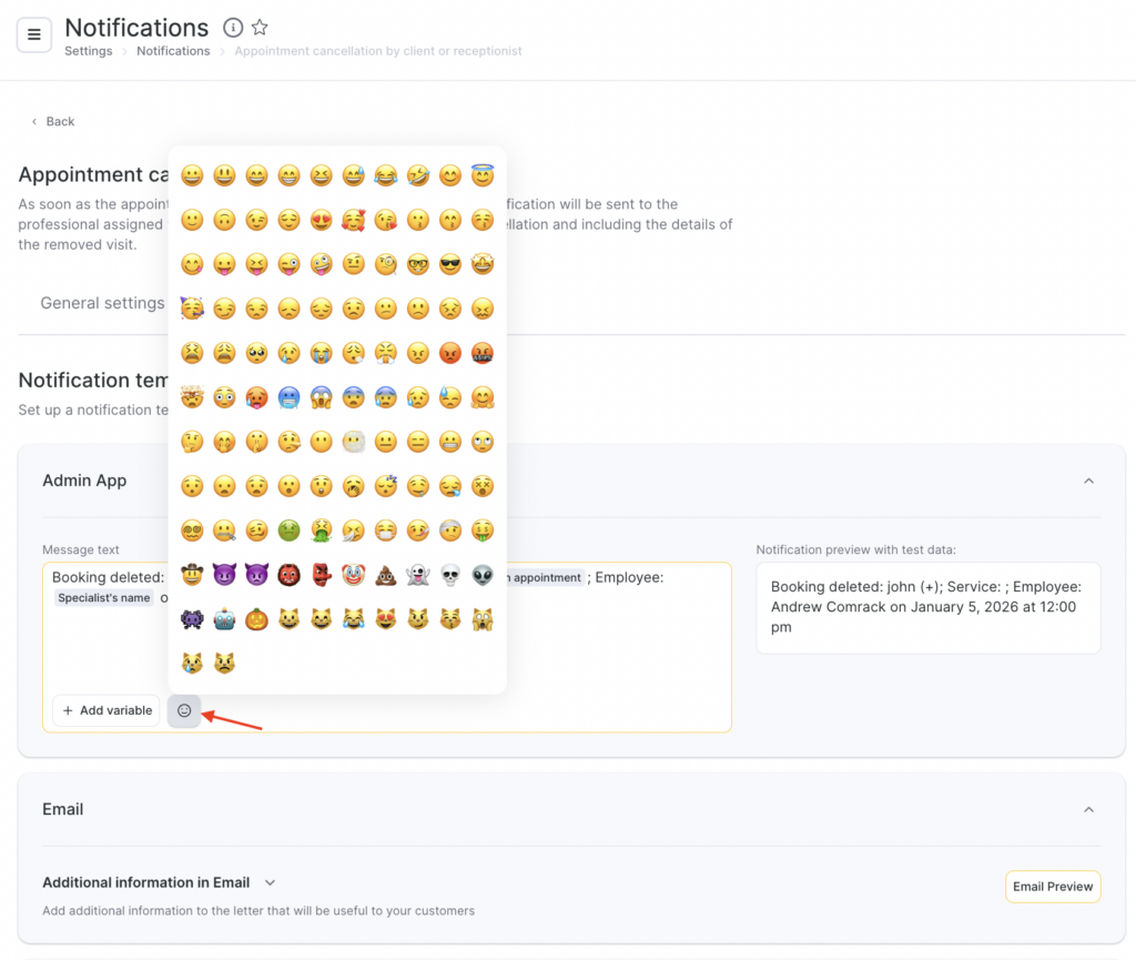 In SMS notification templates, you can use Emoji. To do this, click the smiley button and choose one from the list or add your own.