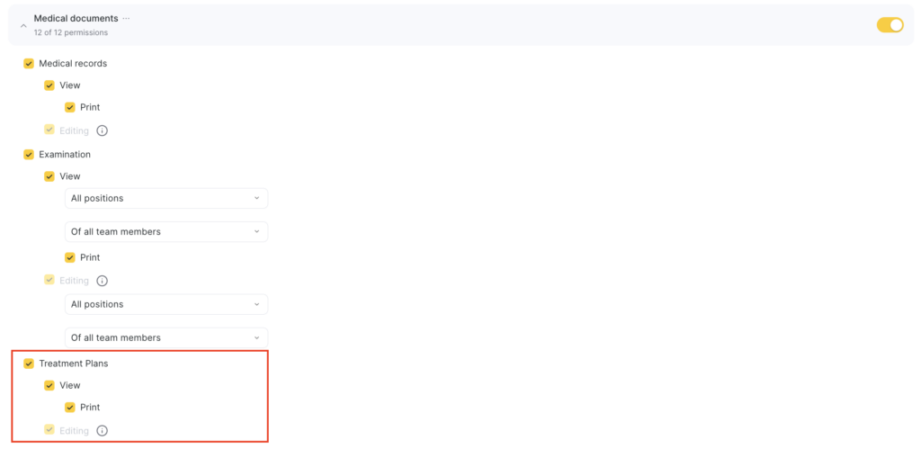 - In Medical documents, enable Treatment plans > View. Also enable additional permissions for printing and editing if needed.