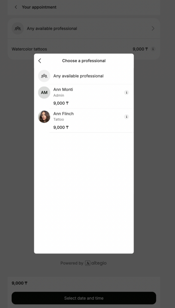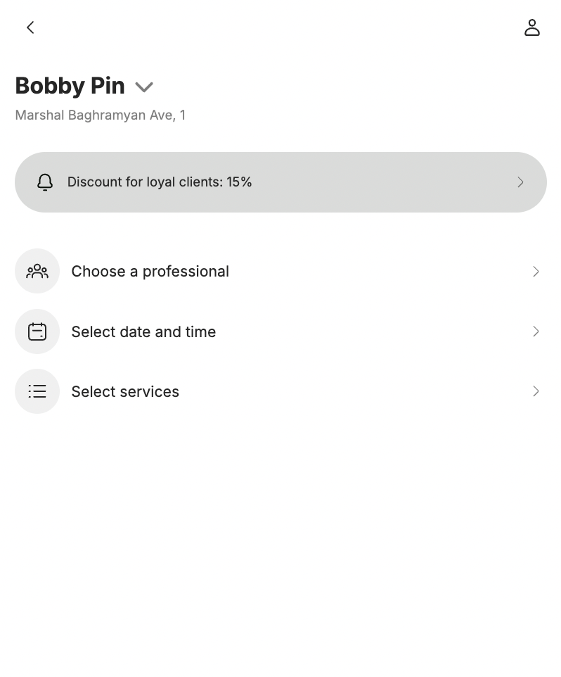 You can also hide the professional selection step — in that case, the booking will be assigned to the preselected employee with no option to choose someone else.