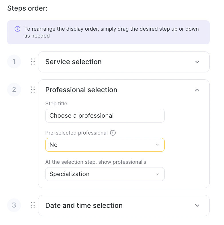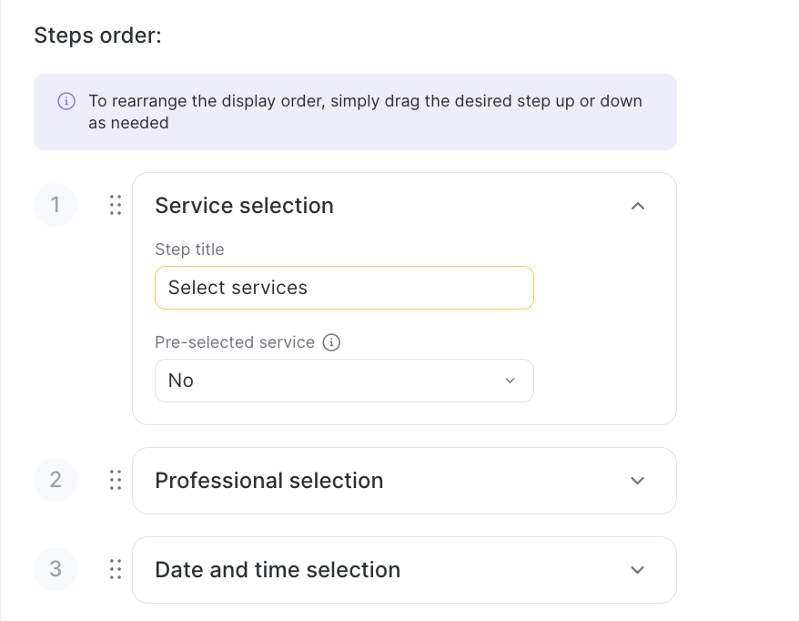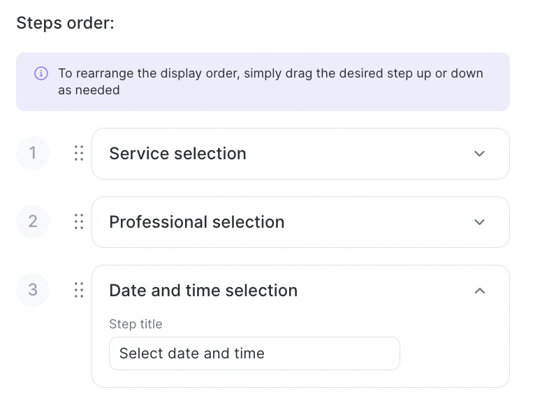 To change the order of steps, click and hold the dotted icon to the left of the step name, then drag it to the desired position. The selected sequence will be shown in the online booking widget.