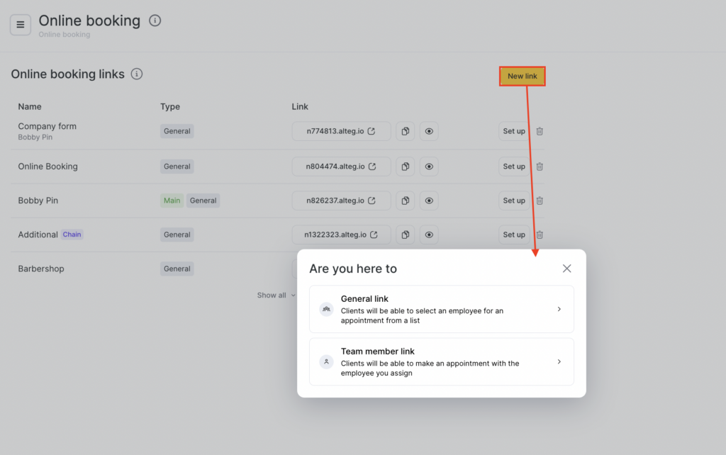 - If you want to create a separate link for one of your employees—or if you run a personal beauty studio with a single specialist—click Employee link.
