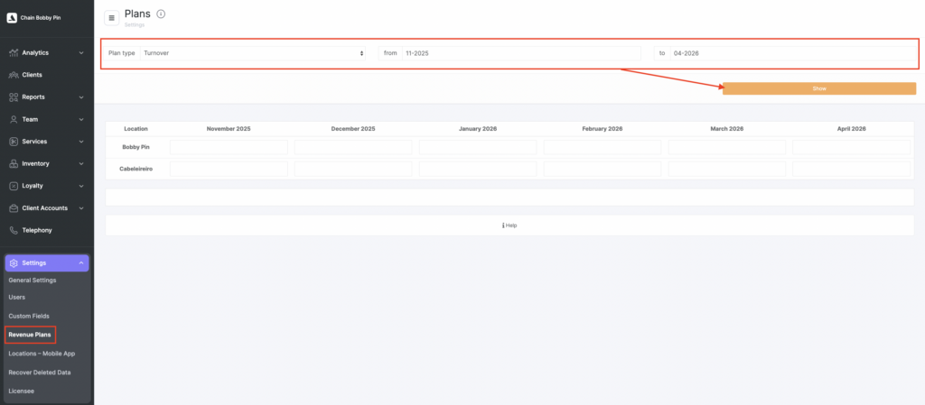 To do this, go to the Settings > Revenue Plans chain section and specify the numbers in each month field for the Turnover plan type. The information will be saved automatically.