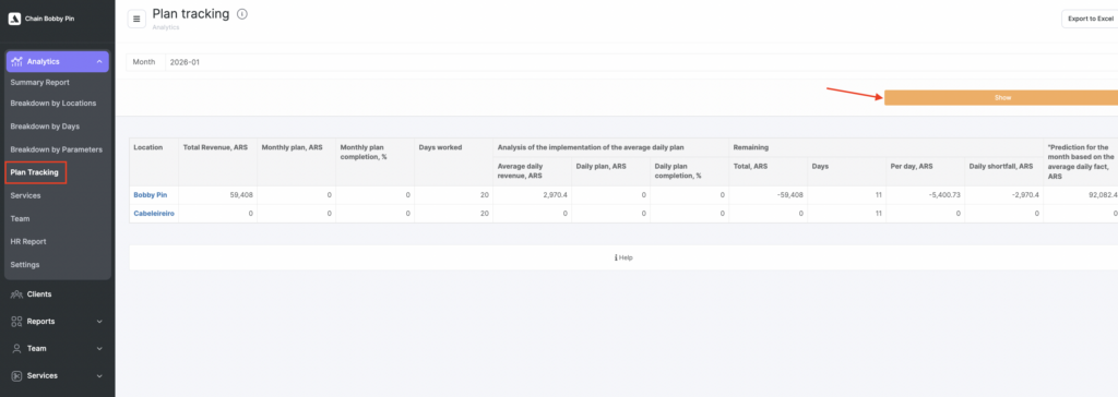 - Per day, $ — amount of the revenue the location should produce per day to fulfill the plan by the end of the month