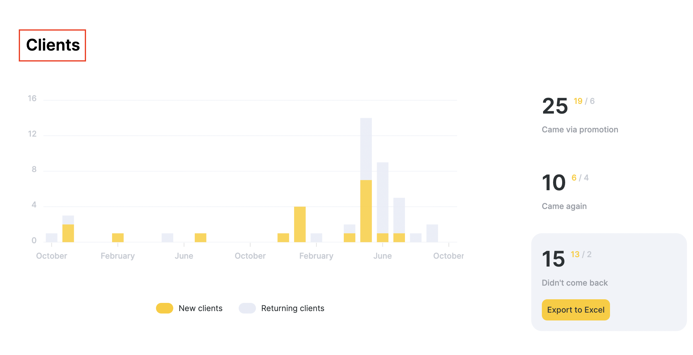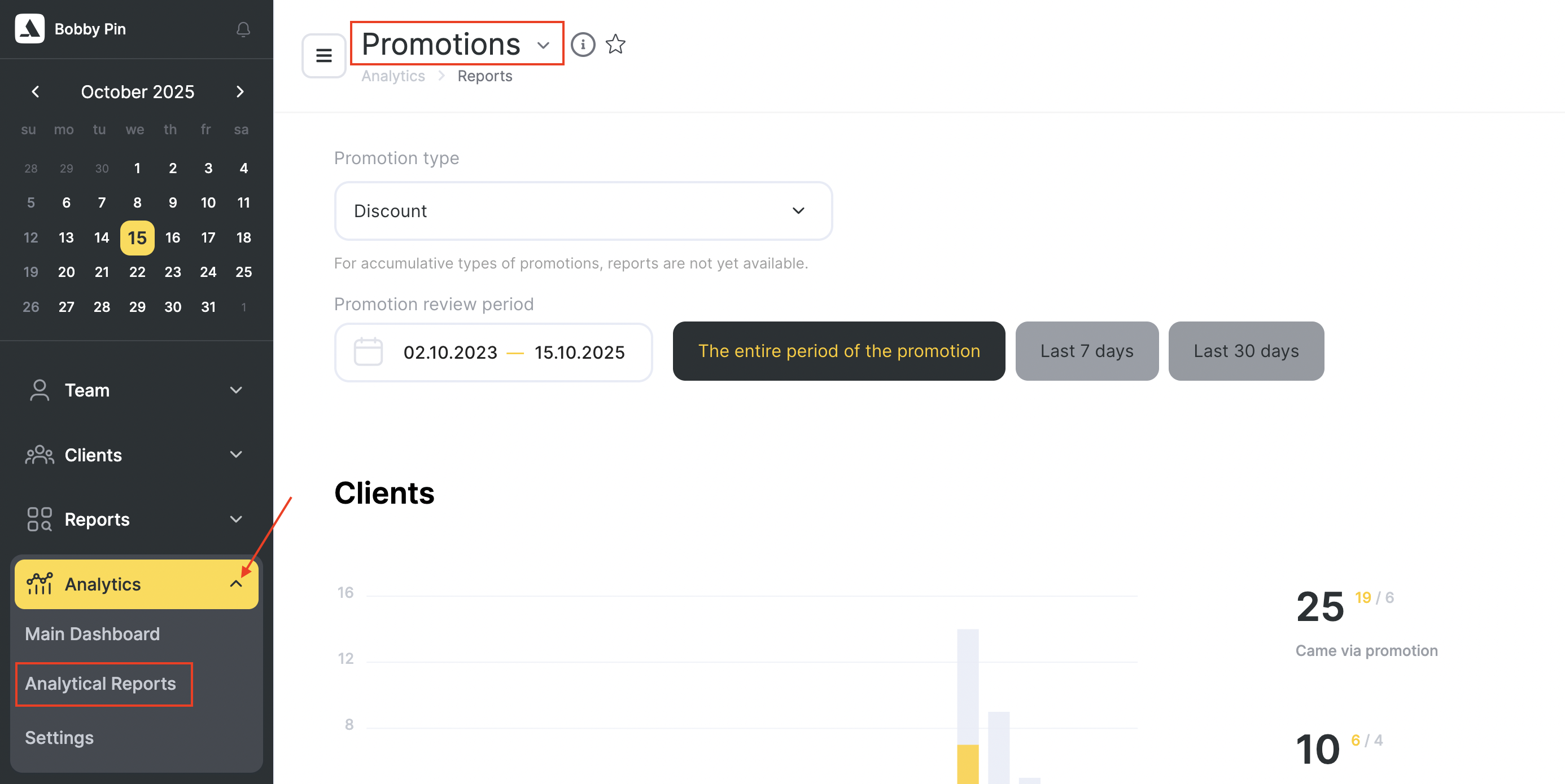 The Clients section will display new and previous clients who came for the promotion during the selected period.