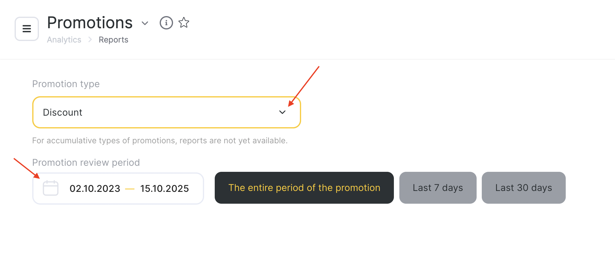 - In the current iteration, analytics can be received only for the following types of promotions: Fixed discount, Fixed cashback (sold), Fixed cashback (paid).