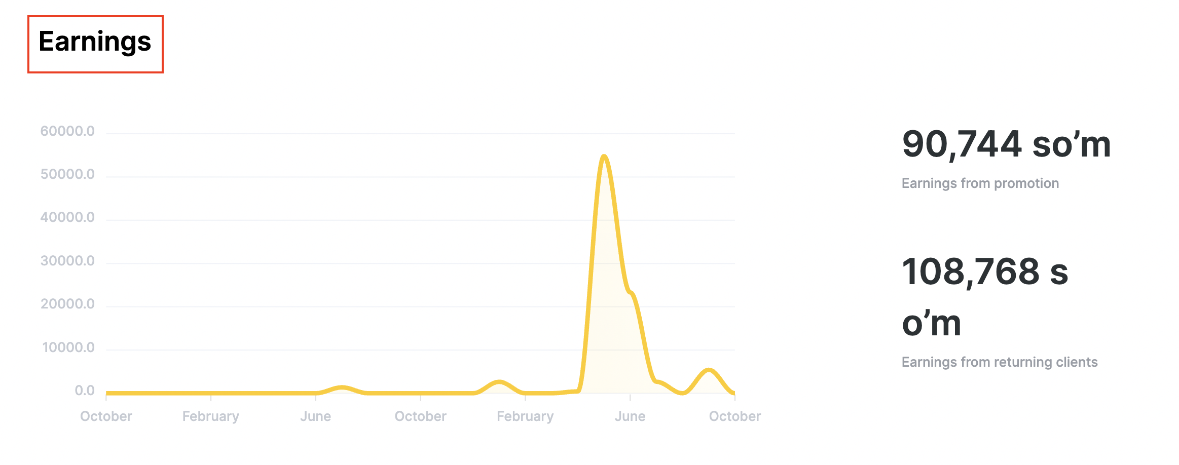 The Earnings section displays earnings from clients who made visits and purchased products for the analyzed promotion, as well as the total amount of revenue received from these clients for any repeated visits to the location.